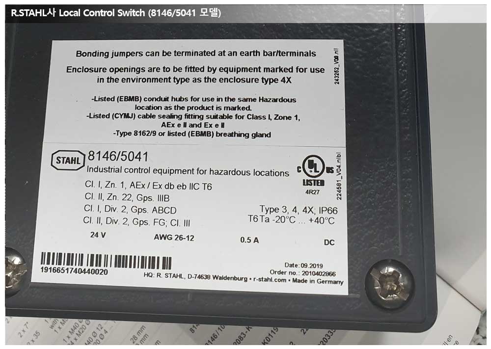 R.STAHL사의 LCS는 ATEX, IEC Ex는 물론 UL인증도 있어 제품에 marking 되어 납품되었습니다.